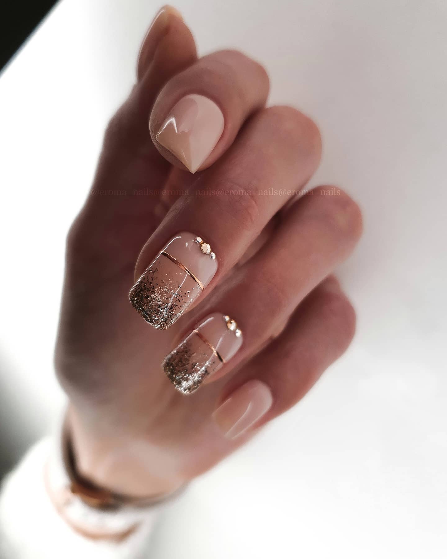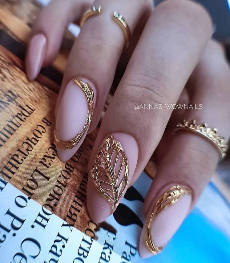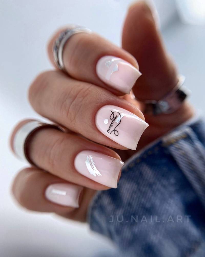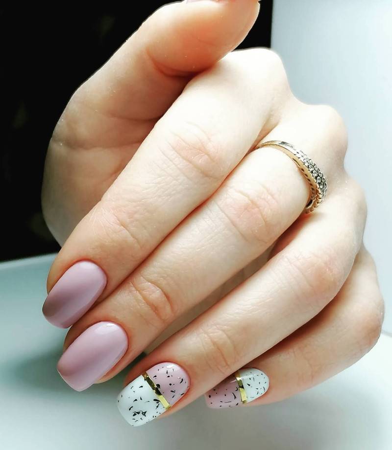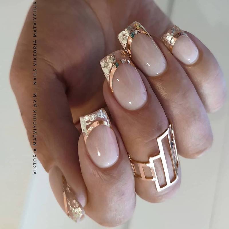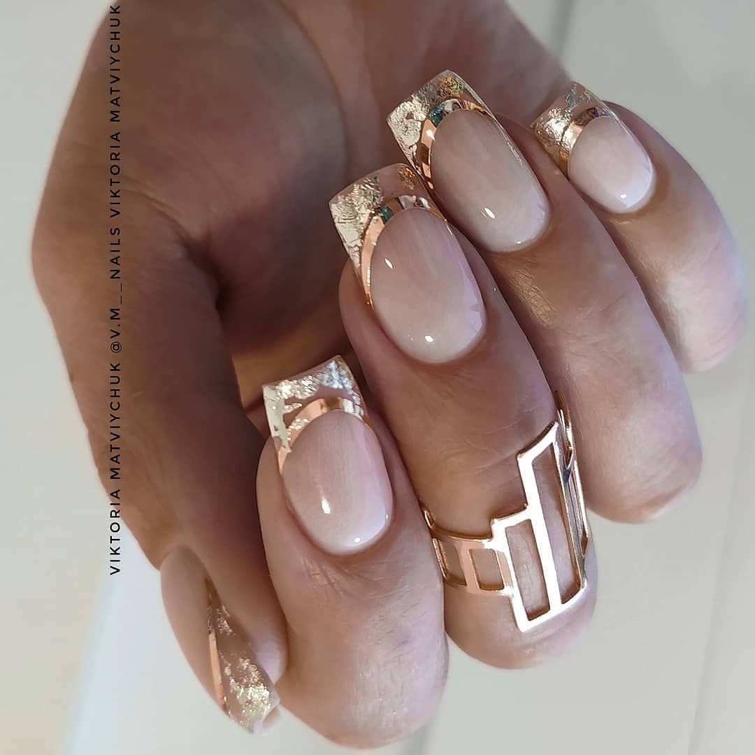 Даже незначительный кусочек блестящей фольги сможет украсить розовый маникюр. Золотистая фольга больше подходит для нюдовых тонов, а разноцветная и серебряная – для более ярких.