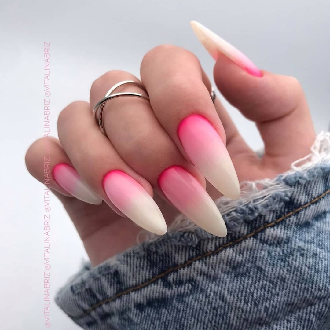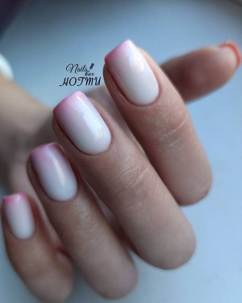 Необычный вариант: ногтевая пластина плавно переходит от ярко-розового к более светлому, а затем к бело-розовому, таким же цветом прорисовывается линия полумесяца у основания ноготка. Нельзя не сказать о розовом френче с эффектом омбре, который всегда очень привлекает модниц.
