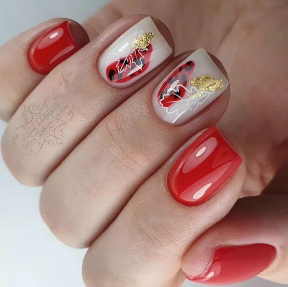 Очень красиво и оригинально смотрятся рисунки фруктов и ягод в сочетании с красным дизайном. Но, такой вариант дизайна более подойдет для летнего маникюра.