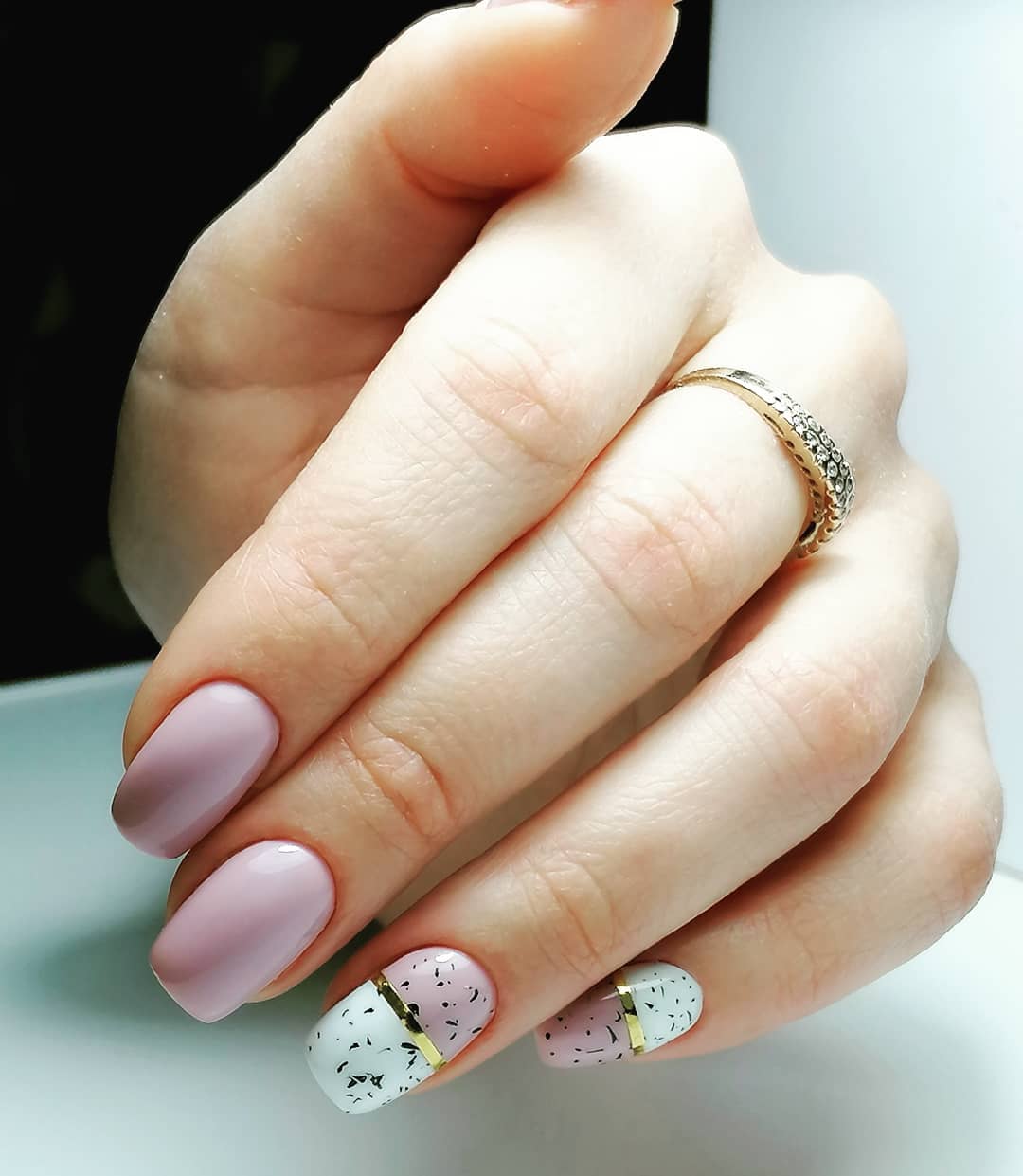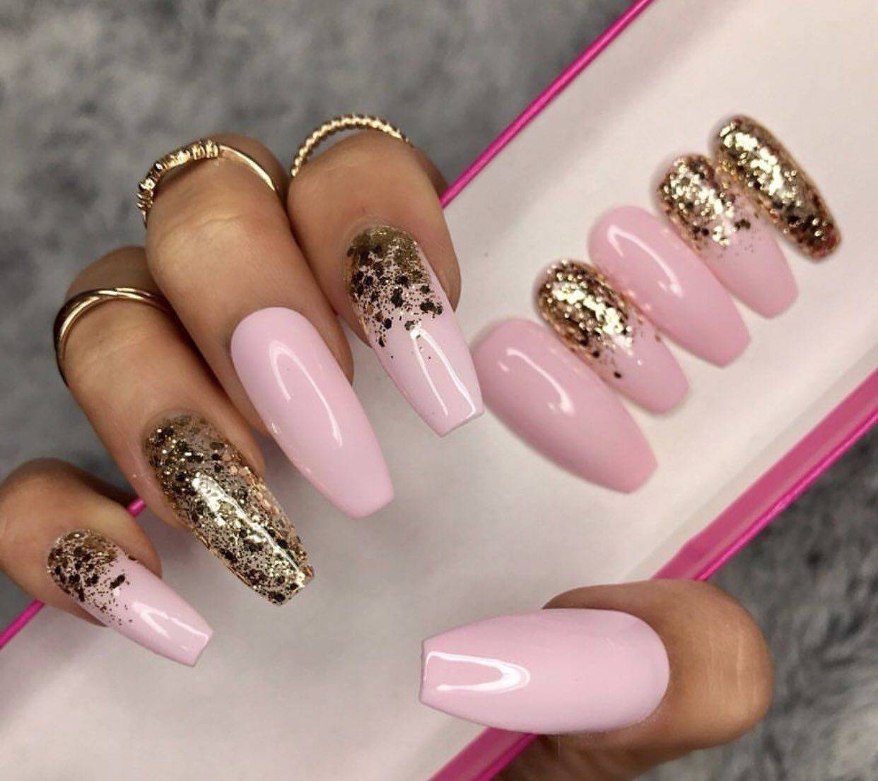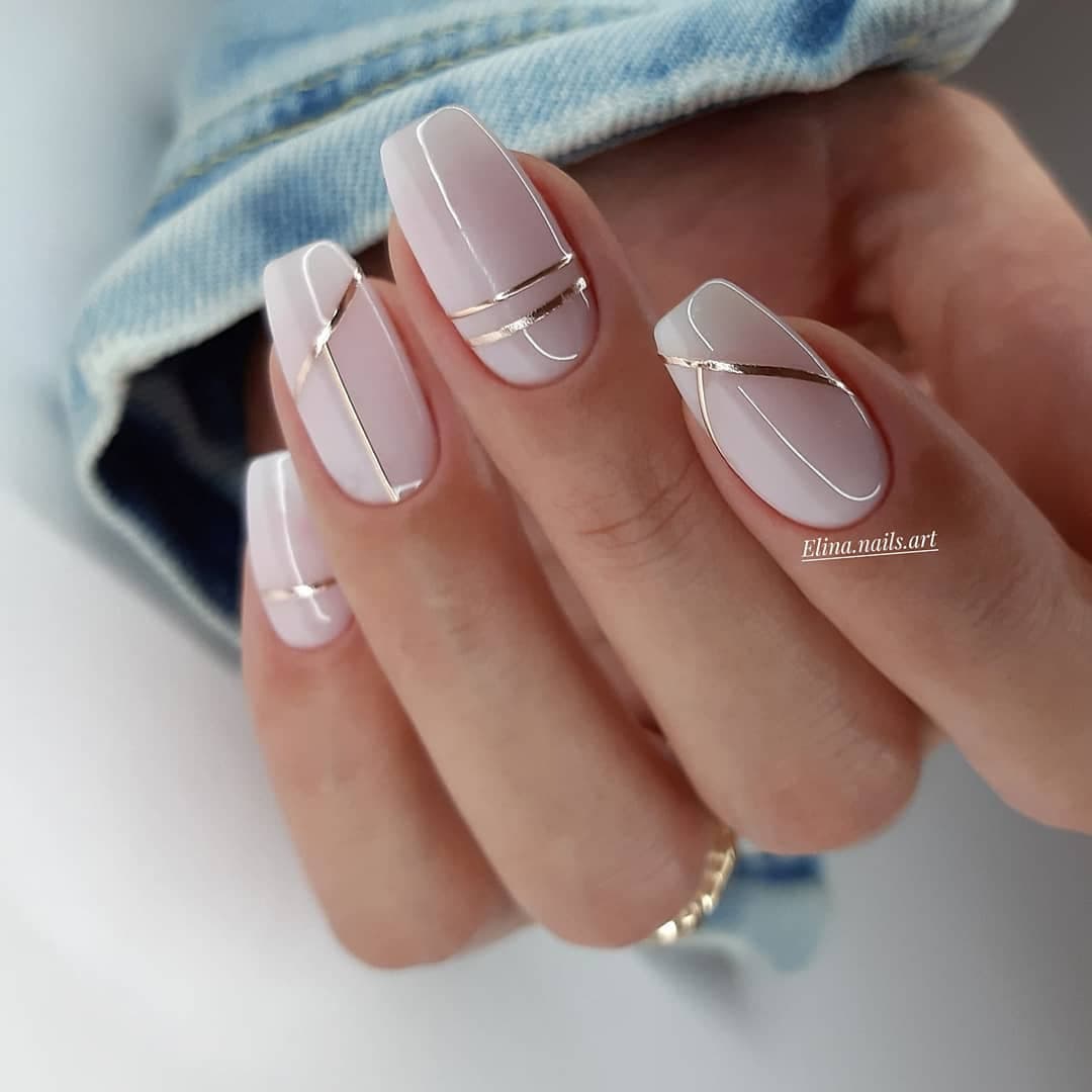 Блеск и золото – одна из самых модных идей для розового маникюра, которое отлично смотрится на любой форме и длине. В качестве дополнения готового дизайна можно выбрать золотые полоски, расположить которые можно по горизонтали, вертикали, диагонали.
