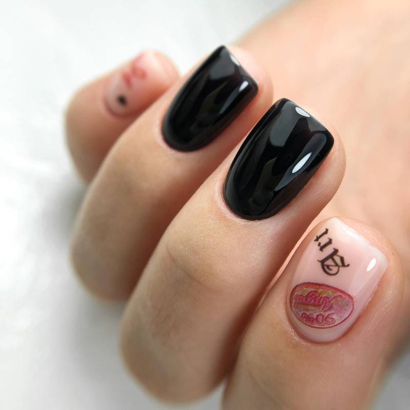 Как мы упоминали выше, розовый прекрасно сочетается с базовыми цветами, одним из которых является черный. В маникюре эта парочка выглядит очень элегантно и стильно, образуя эффект инь-янь: розовый разбавляет глубокий черный, а вместе они балансируют насыщенность и яркость друг друга.