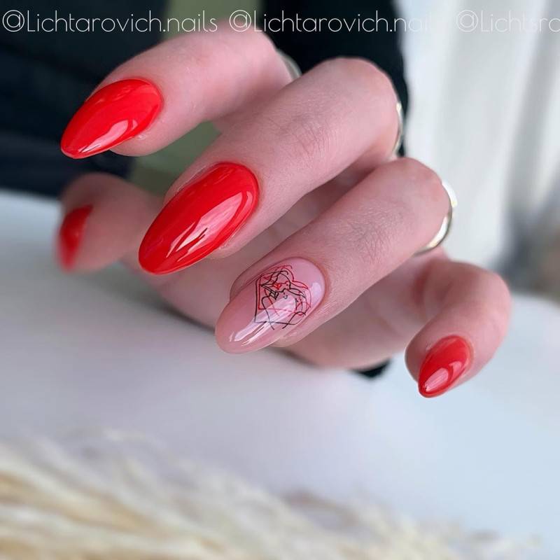 Вторым по-популярности, в этом сезоне является красный маникюр с различными рисунками. Это самое востребованное и желанное сочетание — вне моды и времени. Как мы знаем, красные ноготки любит большая часть прекрасной половины человечества, и рисунки на ноготках предпочитает не меньшее их количество.