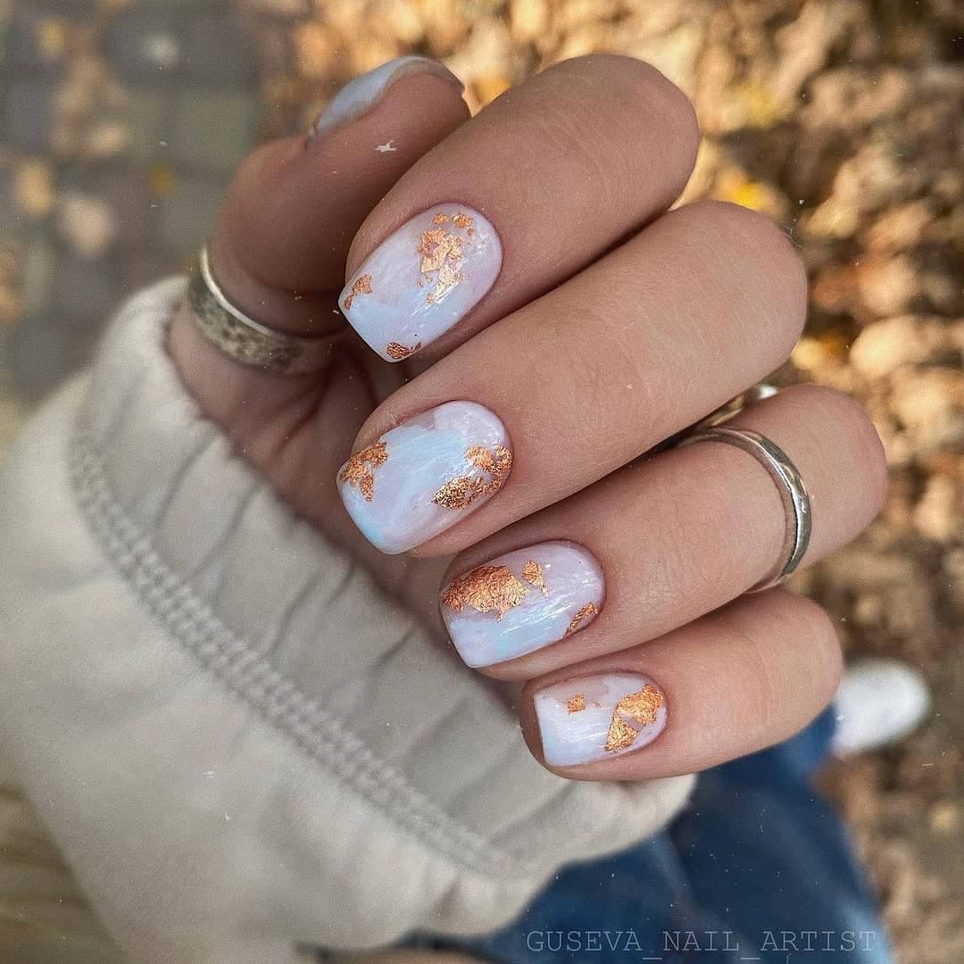 Этот элемент декора может по-разному украшать ноготки в виде полос и геометрических фигур, воссоздавать мраморный эффект. С переливающимися розовыми оттенками «единорог» и «хамелеон» очень эффектно будет смотреться дизайн «битое стекло».