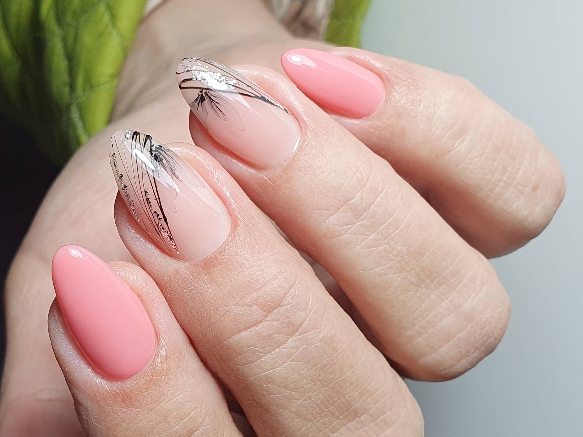 Разнообразить классический однотонный маникюр можно добавлением блесток. В сезоне 2022 в тренде растяжка, выполненная блестками разного цвета и размера. С розовым цветом очень красиво смотрятся как копирующие цвет блестки, так и золото с серебром.