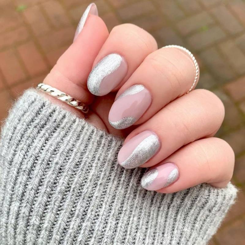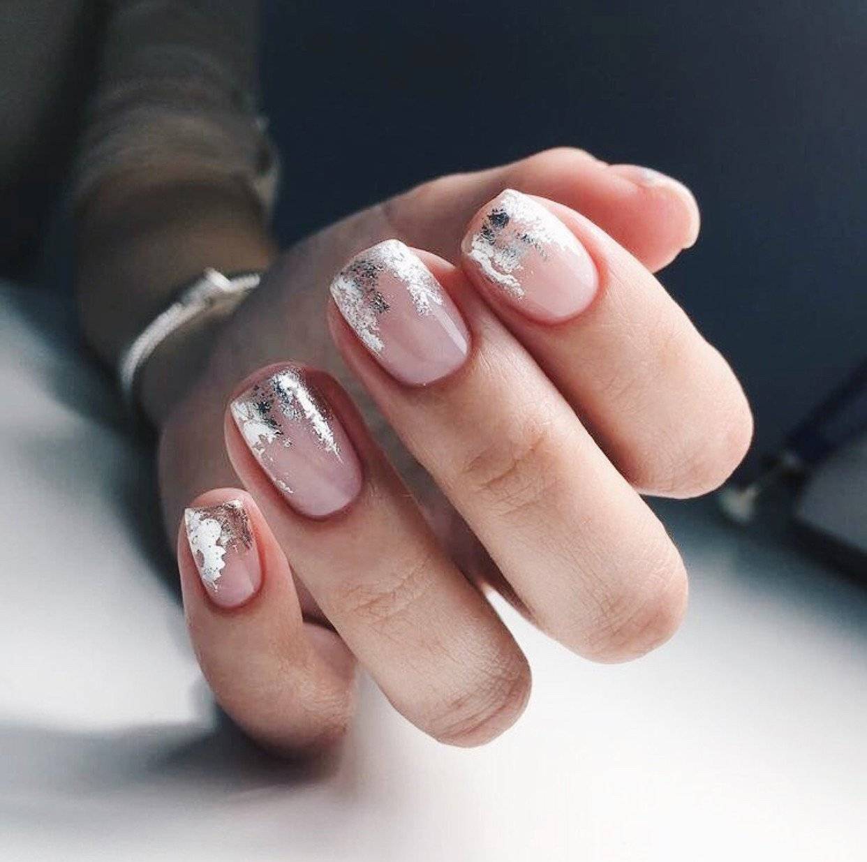Очень модно в 2017 использовать в нейл-арте металлизированные лаки. Если хочется сделать стильный и милый маникюр для романтического свидания или вечером, можно взять спокойный нюдовый оттенок в качестве основы и совместить его с серебристым покрытием, выделить им лунки и полностью окрасить акцентные ноготки.