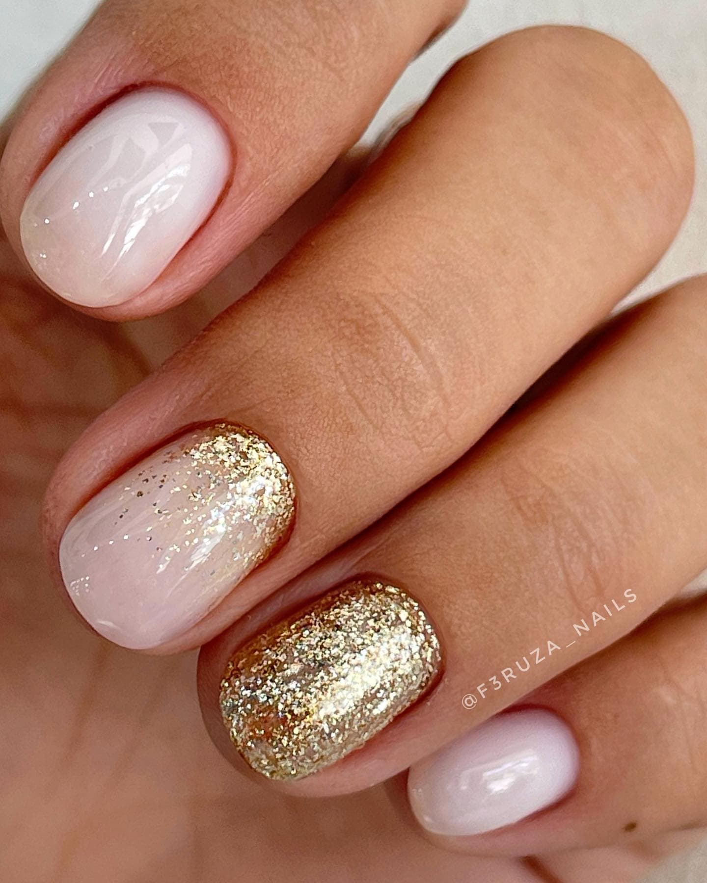 Нежно будут смотреться розовые ноготки с золотым блеском на кончиках, посередине или в самом центре. В сезоне 2022 одним из ключевых трендов стал розовый маникюр с золотым френчем.