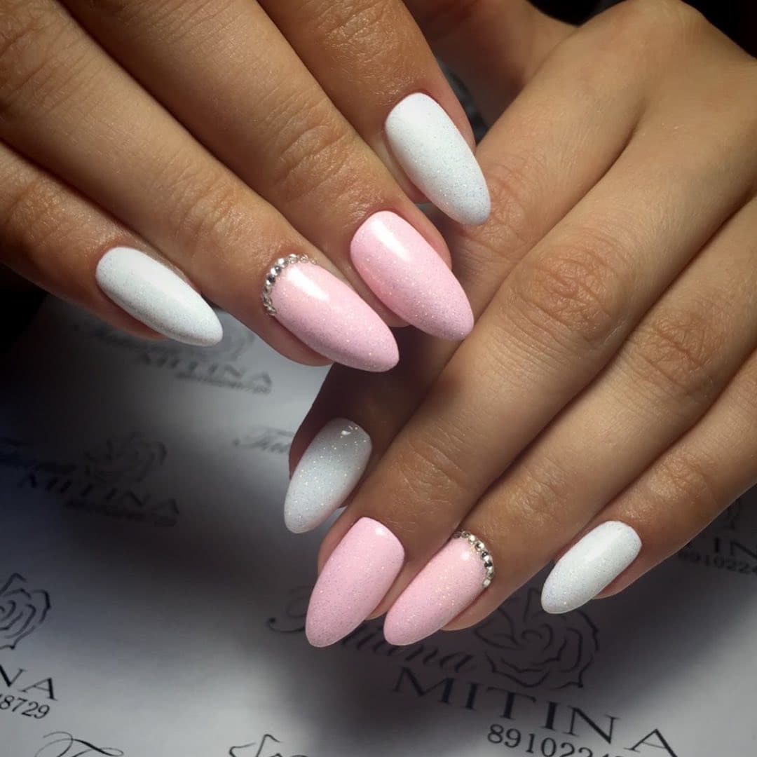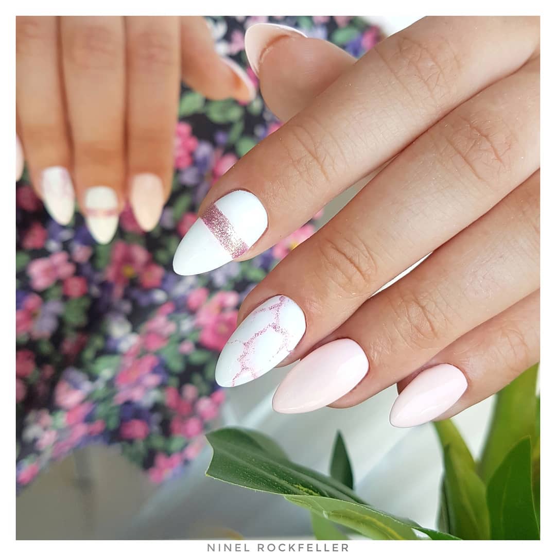 Чтобы сделать белый маникюр в нежно розовых тонах как на фото, ты можешь использовать стразы, градиент, мрамор или фольгу. В этом случае не стоит бояться ярких элементов — на таком лаконичном фоне они будут выглядеть уместно.