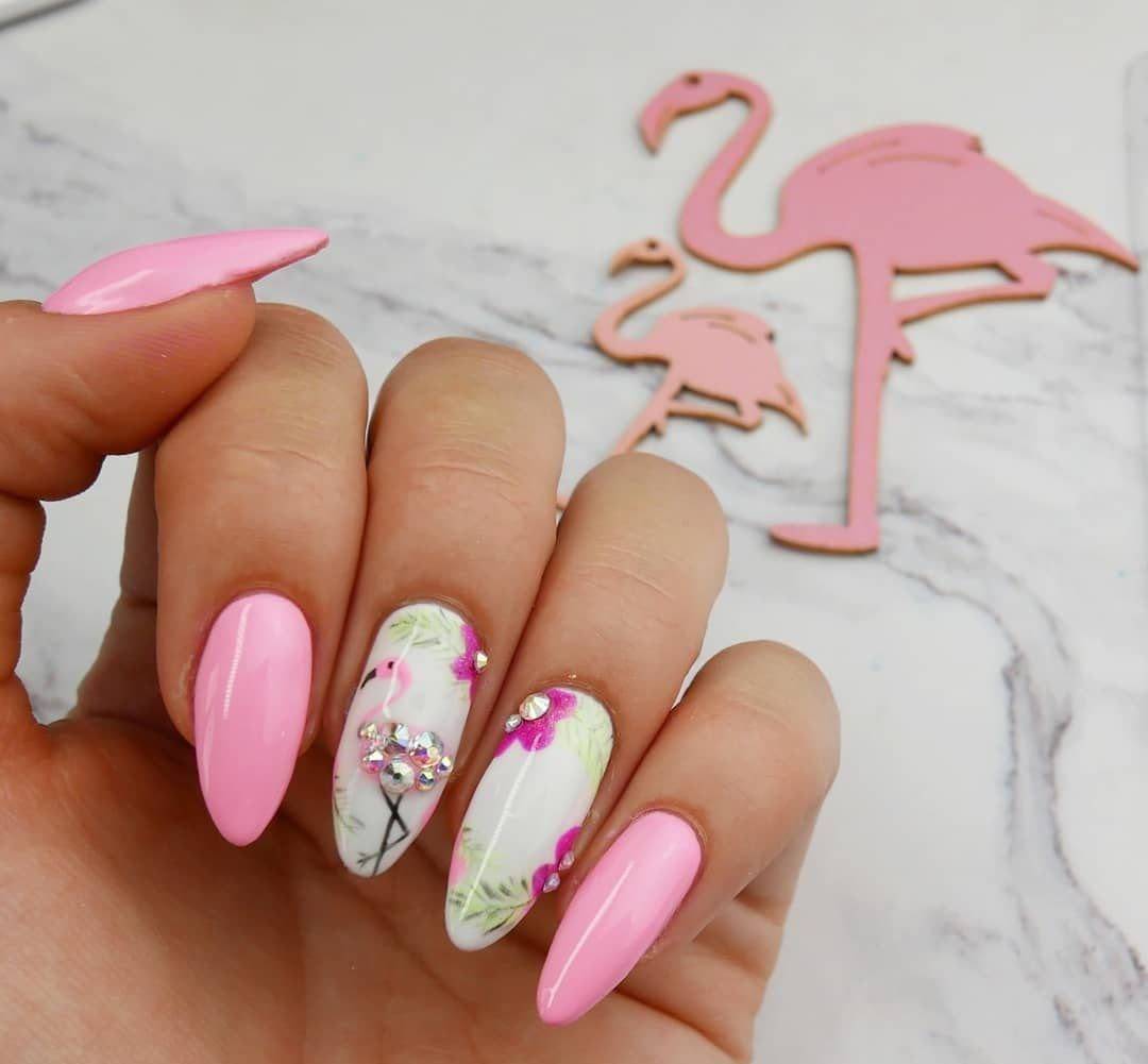 Розовый маникюр просто немыслим без птицы аналогичного цвета. Мастера довольно часто в сезоне 2022 будут использовать рисунки или наклейки с изображением фламинго. Интересно, что фоном должно стать именно розовое покрытие, которое смотрится в «паре» с птицей невероятно гармонично.