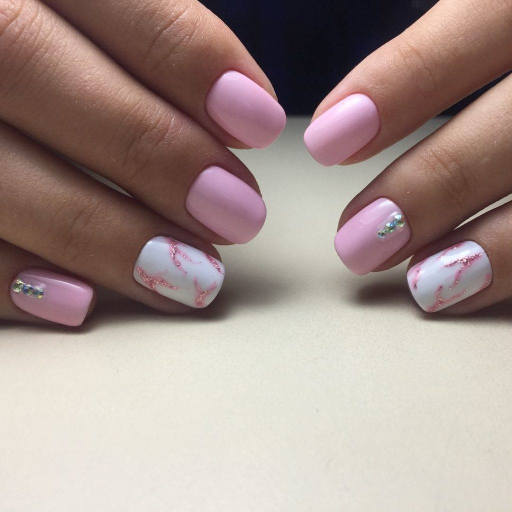 Мраморный розовый на ноготках подкупает модниц своей нежностью и легкостью, представляя собой рисунок натуральных камней. Такой дизайн можно выполнять как на всех ноготках, так и на одном или двух. Эффектно дополняется мраморный дизайн втиркой с зеркальным блеском.