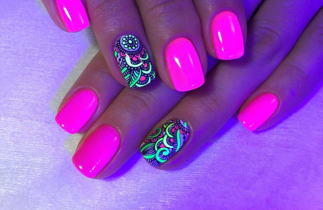 Яркий маникюр с рисунками неоново-розового цвета