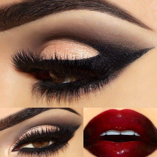 Винные губы с четким контуром хорошо сочетаются с темным классическим смоки айс. Также блондинкам подойдут коричневые, бежевые тени. Трендом в макияже 2021 стал красный или бордовый смоки айс, при выполнении которого используют помаду. Такой образ будет уместен на праздничной вечеринке, фотосессии.