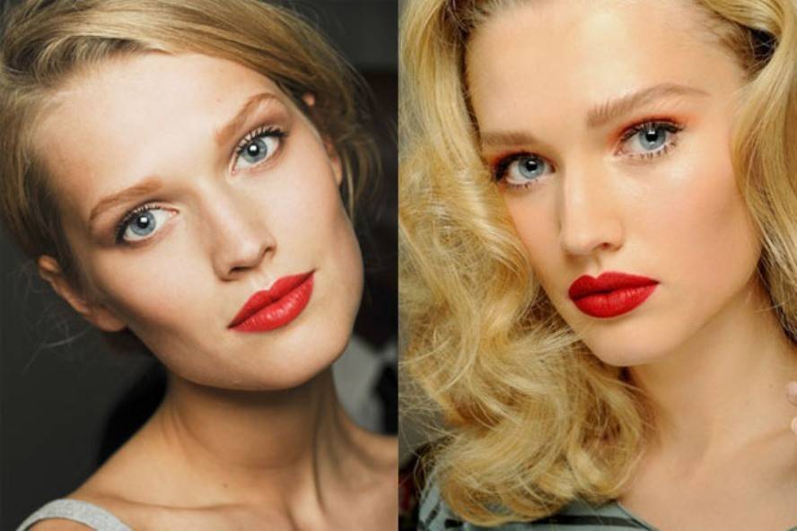 Прокрашенные ресницы завершат макияж глаз, а алая помада станет финальным аккордом. Не забудьте обвести губки карандашом, а потом его растушевать. Не стоит думать, что красный подходит лишь для вечера. В дневном макияже он тоже уместен. Ровный тон лица, аккуратные брови, пышные ресницы и соблазнительные вишневые губки – классика жанра.