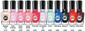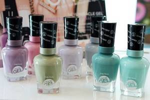 Обе коллекции имеют экземпляры тонов с блесками, шиммером и голографическим глиттером. Гель-лаки Miracle gel Sally Hansen имеют в своей палитре всевозможные цветовые оттенки. Здесь вы сможете подобрать и нежные спокойные цвета, такие как: 110, 160, 240, 380, и более яркие импульсивные: 345, 470, 550, 570. А также замечательный нарядный и переливающийся Miracle gel №590.