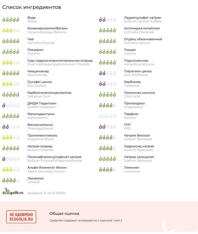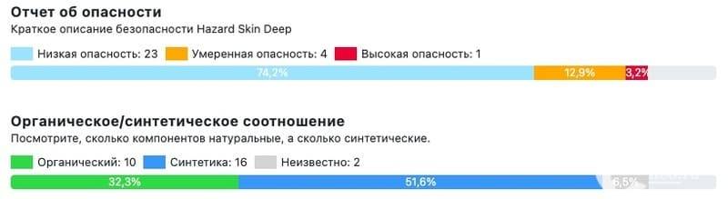С точки зрения натуральности состав получился достаточно неплохим 23 из 31 компонента обладают натуральным происхождением — это неплохой результат для средства, которое не позиционируется даже близко как органическое.