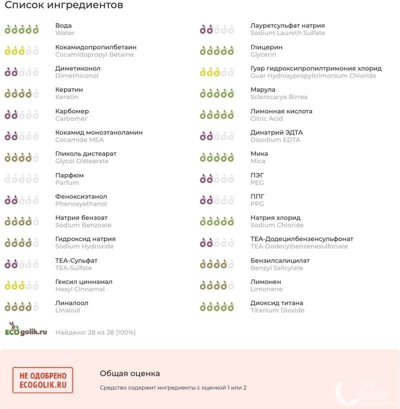 Согласно анализатору экоголик 17 ингредиентов из 28 натурального происхождения, что больше половины и это замечательно. Другим языком 4/6 компонентов полностью натурального происхождения. Оставшаяся 2/6 отвечают за то, чтобы волосы после помывки головы становились мягкими, гладкими и приятными на ощупь, а средство не портилось.