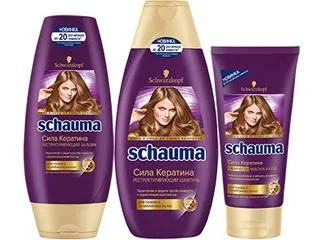 - Schauma Сила кератина относиться к препаратам для домашнего использования. Обеспечивает гладкость локонов, мягкость, шелковистость, восстановление.
