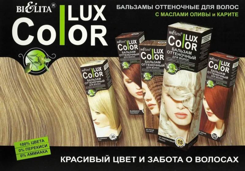 Очень удобное и эффективное средство от белорусских производителей — оттеночный бальзам Color Lux, используется для тонирования волос. Косметические средства «Белита» прекрасно восстанавливают структуру. Особенно специалистами рекомендуется использование препаратов «Белита» для тонких и ослабленных волос, чтобы волосы после окрашивания сохраняли тональность и восстанавливали свои здоровые качества — оттеночный бальзам «Белита Lux».