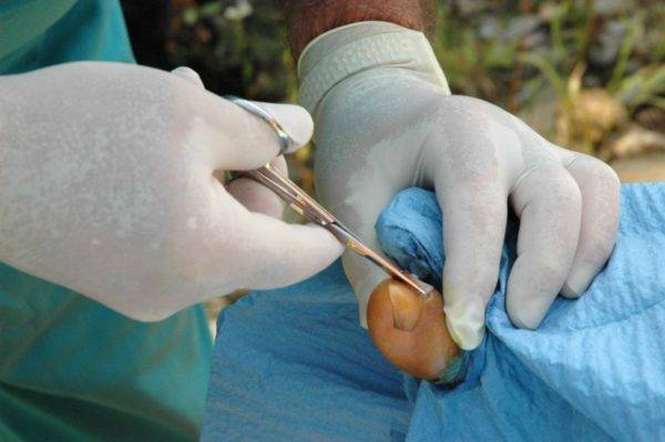 При лечении тяжелых форм показано и хирургическое удаление ногтевой пластины. Оно становится оправданным потому, что споры грибков при тотальном поражении скапливаются в толще роговых масс, расположенных между ложем и пластиной, и остаются недосягаемыми для местных и системных антимикотиков. Удаление пластин ликвидирует сам источник инфекции.