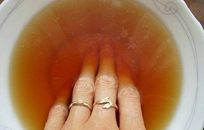 - Ванночки с уксусом. Делать их лучше всего 3 раза в неделю. В подогретую до 50 градусов воду добавляем стакан 6%-ного уксуса. Помещаем в ванночку руки или ноги с поврежденными ногтями и держим 15 минут. После этого их насухо протираем. На ноги надеваем х/б носки