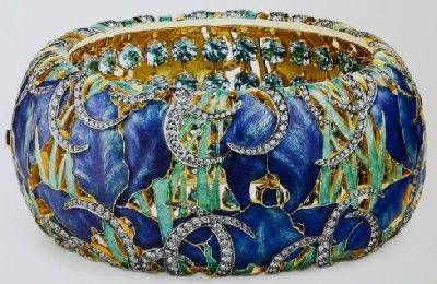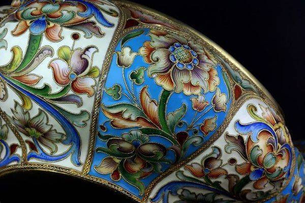 . Это одна из самых нарядных техник исполнения. Золотые или серебряные ленточки-перегородки напаивают на поверхность основы по намеченному рисунку, образуются ячейки, которые заполняются эмалевым порошком. Далее при температуре 600-800 градусов эмалевый порошок плавят, превращая в стекло.