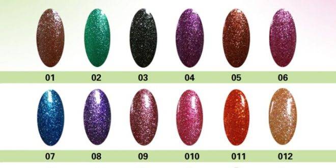 Включает в себя 12 оттенков с мелким глиттером.