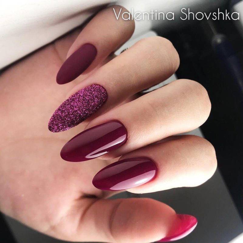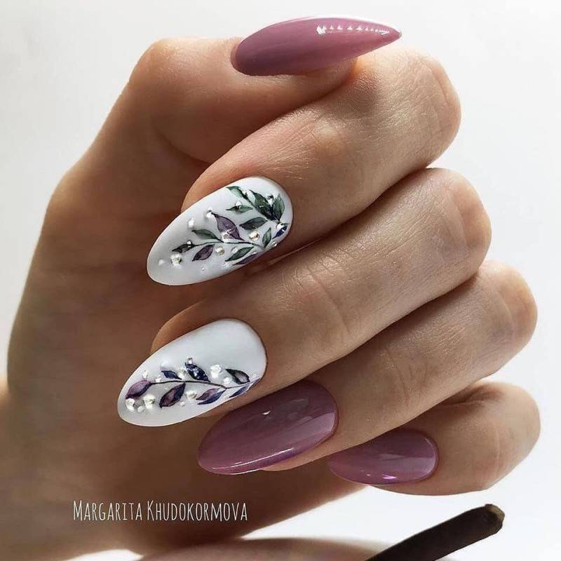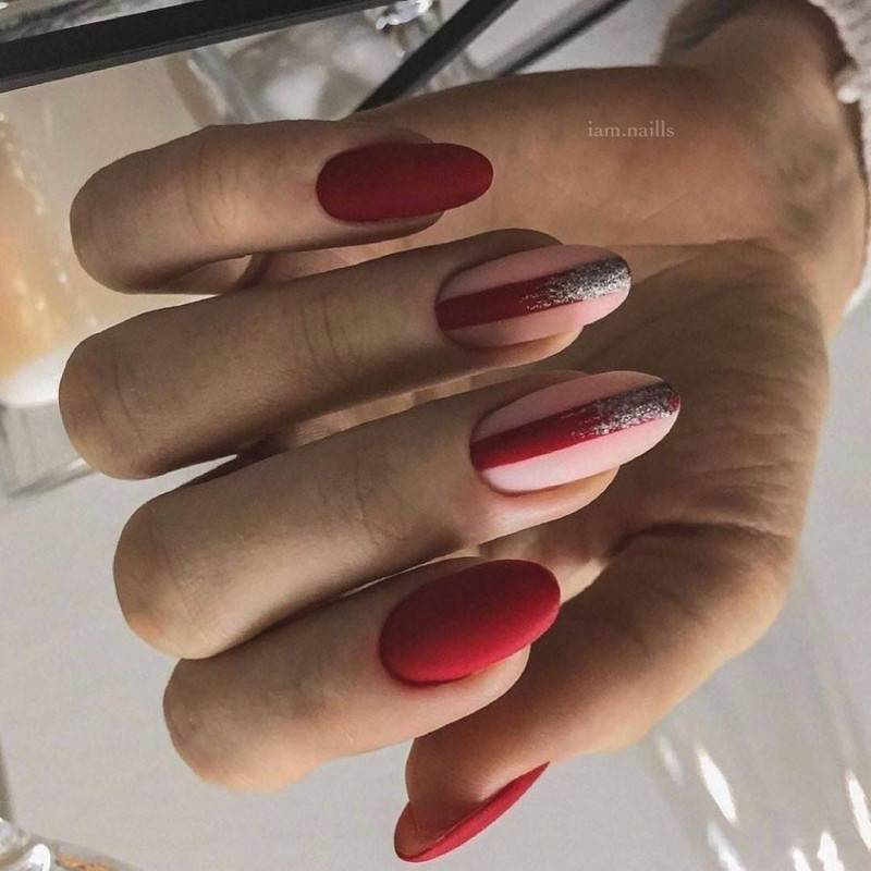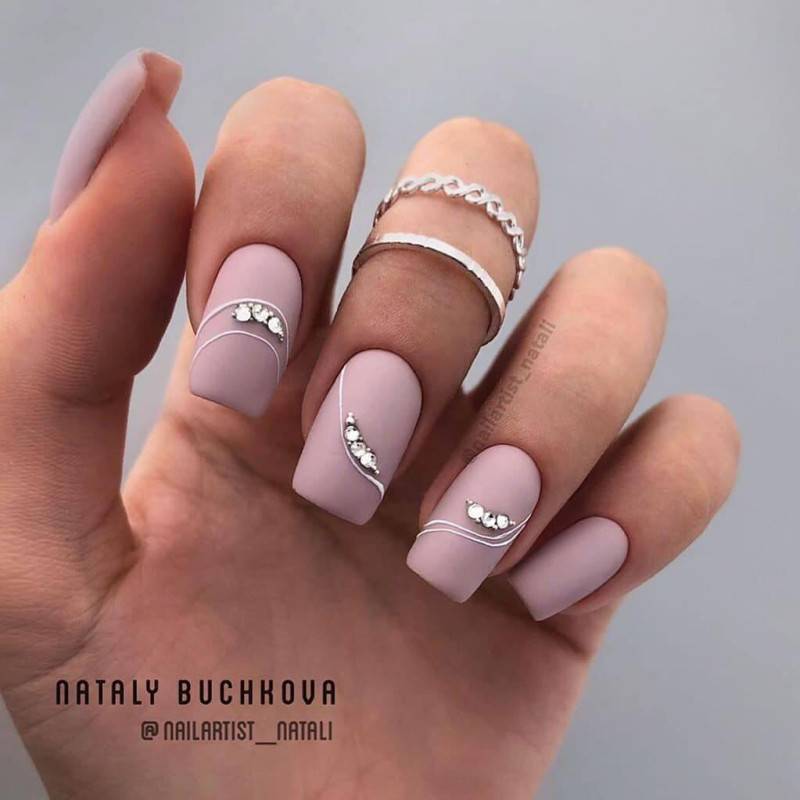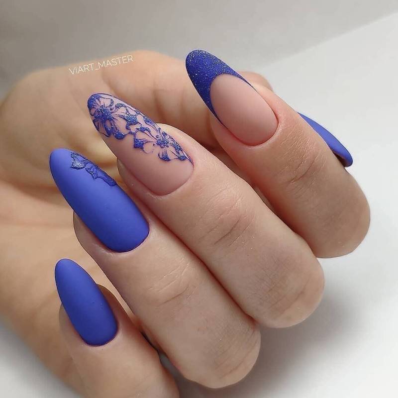 Среди модных трендов — микс матового и глянцевого маникюра. Игра текстур в сочетании с декорами дает потрясающий эффект. Красиво смотрится бархатный нейл-арт в виде френча, французского, лунного маникюра. На матовый фон хорошо смотрятся флористические рисунки, стразы, лепка.