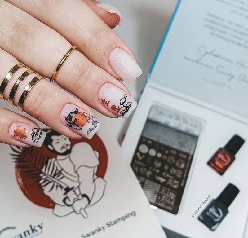 - Выберите пластины для стемпинга и воспользуйтесь пигментированным лаком;