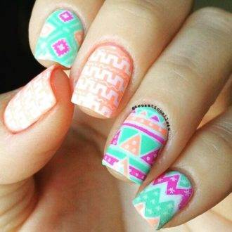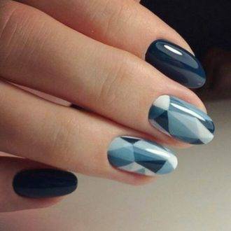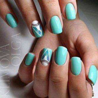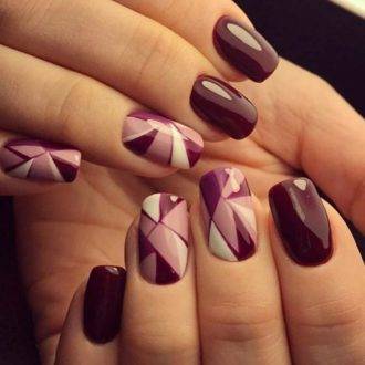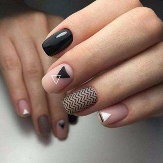 Использование изображений геометрических фигур будут не менее модными нежели в этом. Зигзаги, точки, треугольники, квадраты будут сочетаться на ногтях по одной из особенностей – величине, форме, цвету. Для ноготков разной длинны прекрасно подходят геометрические узоры. Также, многие стилисты рекомендуют объединять модные полоски геометрическими узорами, зонируя ногтевую пластину на части, где в каждой располагается своя фигура. Большим плюсом этого нейл-дизайна есть зрительная коррекция природной формы «родных» ногтей – которые визуально выглядят длиннее и уже.