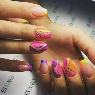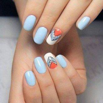 - летний маникюр подразумевает яркие цвета: можно покрыть ногтевую пластину красным, оранжевым или синим шеллаком;