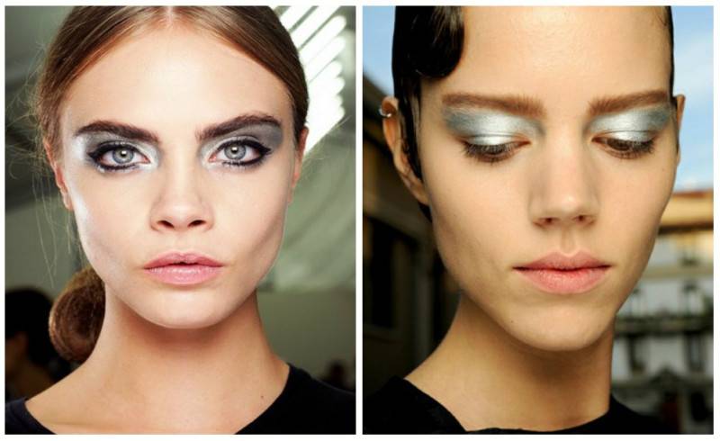 - Этот оттенок довольно самодостаточный, но «выступать соло» в макияже ему не рекомендуется, иначе результат может получится упрощенным и вульгарным. Куда красивее будет выглядеть макияж серебряным карандашом и нежно-голубыми тенями. Хотя для модных показов визажисты нередко используют именно монохромный make up с серебристые тенями, но их цели обычно кардинально отличаются от целей обычных девушек при создании макияжа.