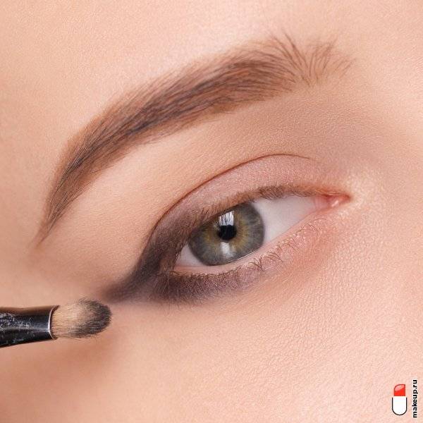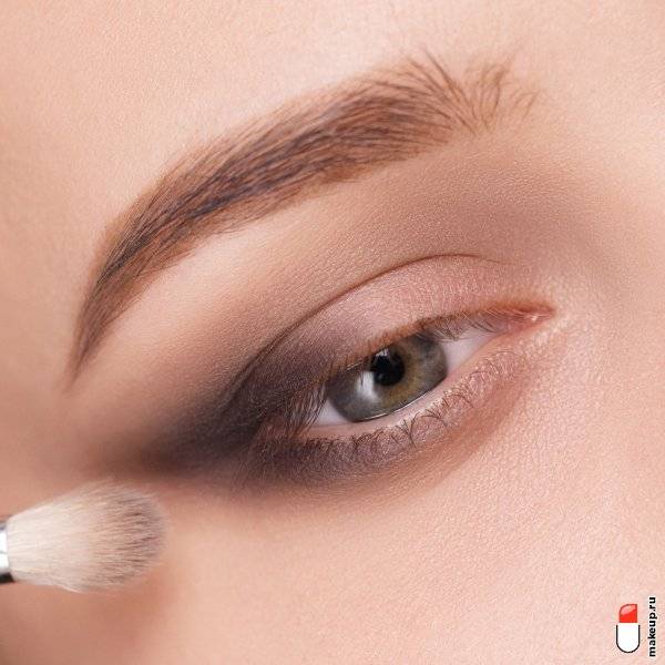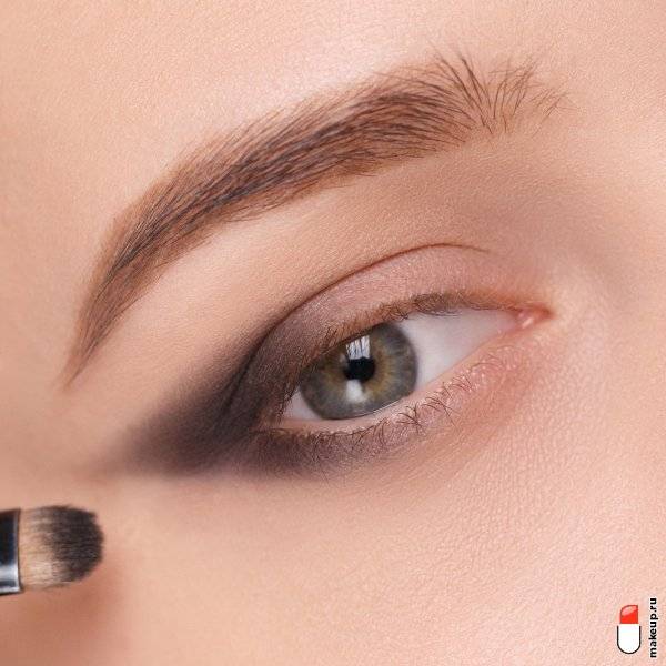 Серовато-бежевыми или светло-коричневыми матовыми тенями при помощи пушистой натуральной кисти растушуйте границы (только границы!) черных теней как на верхнем, так и на нижнем веке.