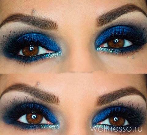 Одно из самых распространенных заблуждений – кареглазым особам не идут голубые и синие тени. По фото видно, что это явно ошибка, поэтому не будем идти у нее на поводу. При помощи популярных цветов можно сделать легкий вариант макияжа для карих глаз на каждый день или насыщенный вечерний.