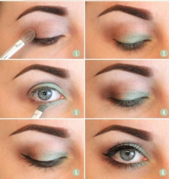 - требуется накрасить свежие зеленые матовые тени вплоть до середины большого века, начиная с внутреннего угла века;