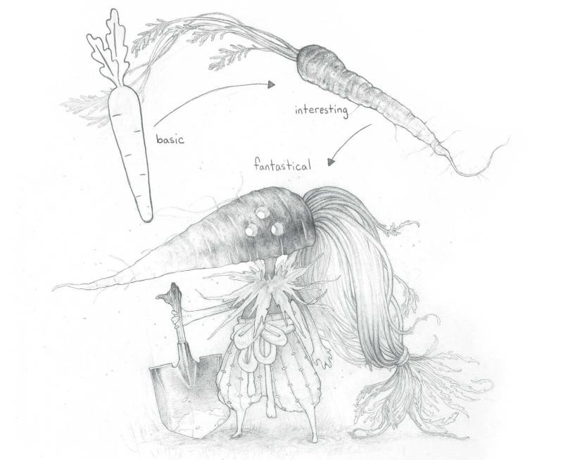 На рисунке выше вы видите три разные моркови. Первая морковь – это то, что нам сразу же приходит на ум при мысли о предмете. Второй пример – реалистичное изображение моркови с детализированными бугорками и складками, которые вызывают интерес. В третьем примере фон Рюден пошел дальше и изобразил непривычный нам образ моркови. «Используйте особенности объектов и превращайте обычные предметы в нечто фантастическое», – говорит Тим.