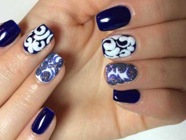 - Покройте ногти черным лаком и с помощью дотса (специального инструмента для точечного рисунка) выполните голубым лаком асимметричный орнамент, как на фото. Нарисуйте белой акриловой краской вензеля для завершения дизайна ногтей.