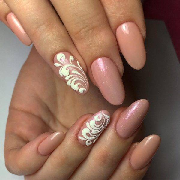 Однотонный рисунок. Для классического маникюра обязательно применение одного цвета, так как все узоры состоят из линий, выделять которые другими оттенками не имеет смысла. Но нередка и практика цветных вензелей.