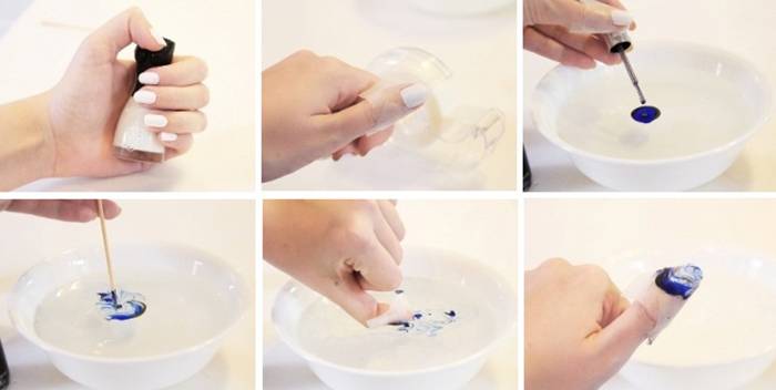 - Смешайте в тарелке с водой 2 любых контрастных лака, просто сделав несколько капель.