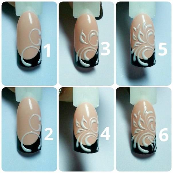 - Попробуйте, следуя пошаговым фото, повторить эффектный розовый маникюр с черным орнаментом из завитков. Этот маникюр подойдет как для натуральных, так и для наращенных ногтей.
