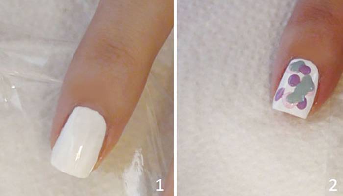 На покрытую одним лаком ногтевую пластину капните несколько капель разного лака.