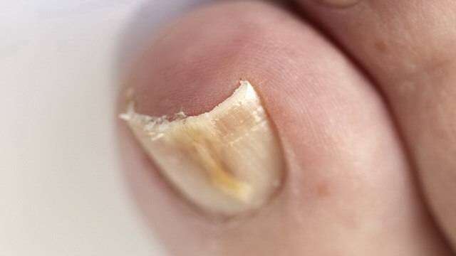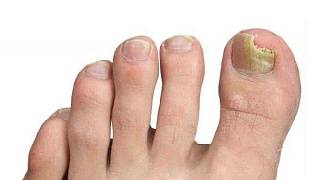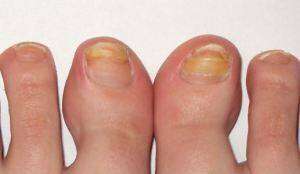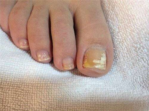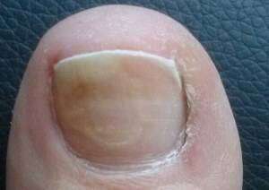 При дистальной форме ногтевого грибка, часто встречающейся на больших пальцах ног, желтоватое пятнышко заражения появляется на удаленном крае ногтя, в его центральной части, как можно видеть на фото.