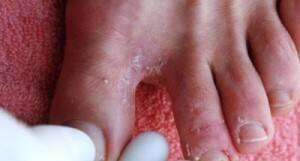 Этот грибок практически не встречается на ногтях рук, часто служит причиной межпальцевого дерматофитоза на ногах, как на фото, и требует одновременного лечения кожи стоп и ногтей.