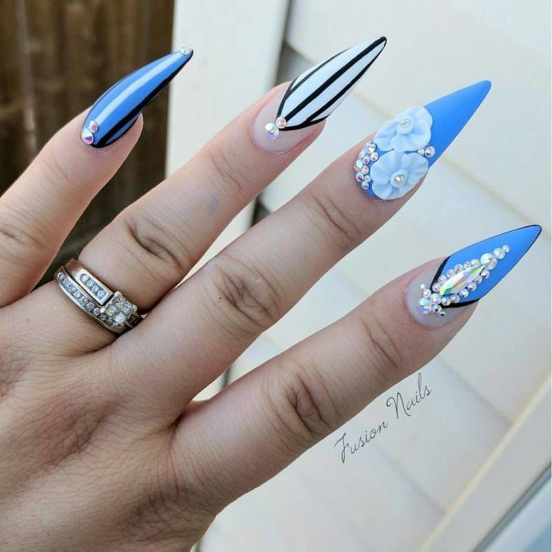 Длинные ногти — возможность для мастера сделать любой маникюр, о котором может мечтать клиентка. Синий цвет можно сделать матовым или блестящим, поэкспериментировать с акварельным покрытием или паутинкой. Крупные стразы на длинных ногтях будут смотреться дорого и вкусно.