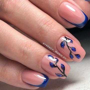 Летом и весной цветы появляются не только на клумбах, но и на ногтях. Если нужен дизайн поскромнее, выбирайте модный синий маникюр “веточки” с небольшими бутонами на полупрозрачной бежевой основе.