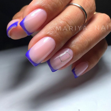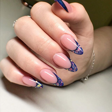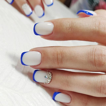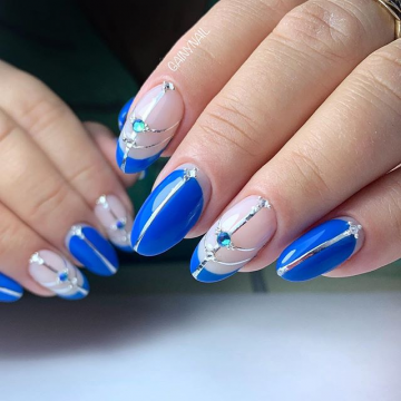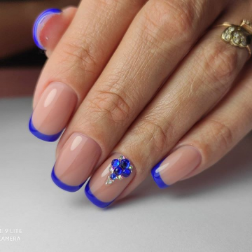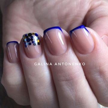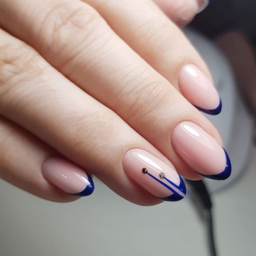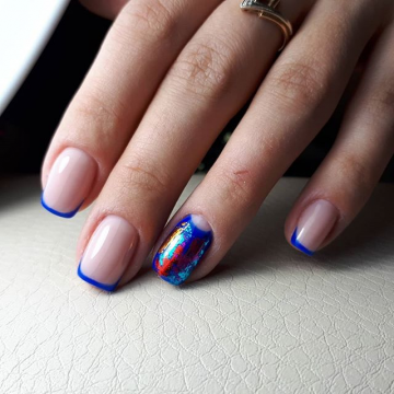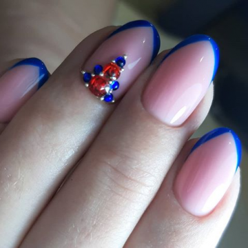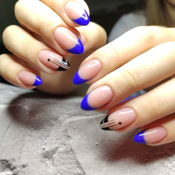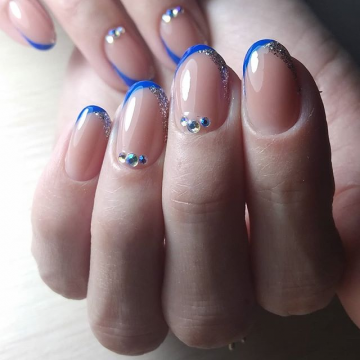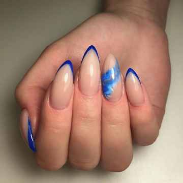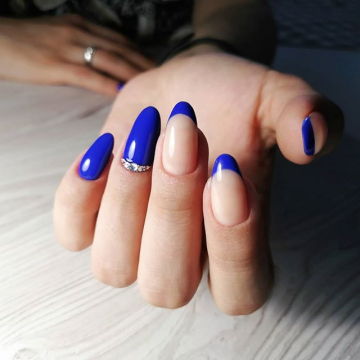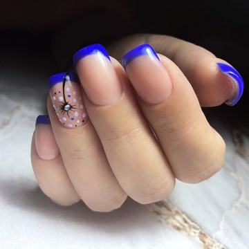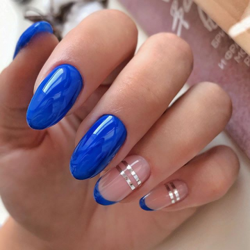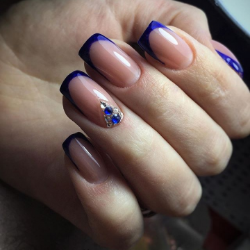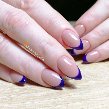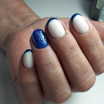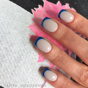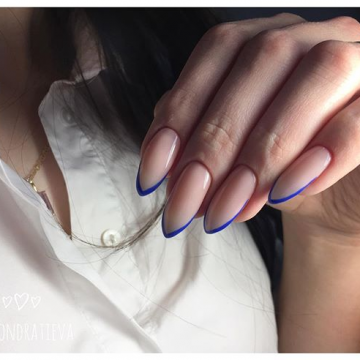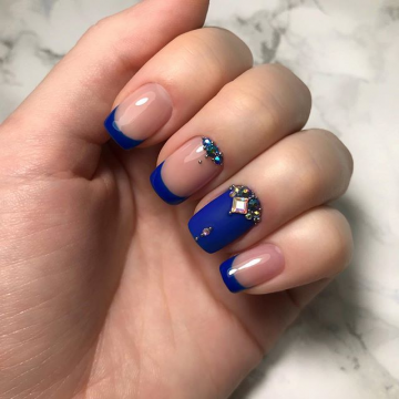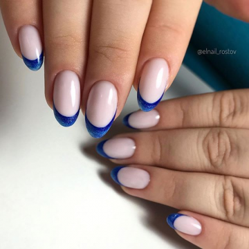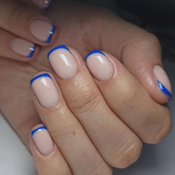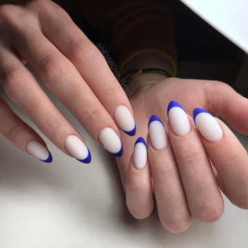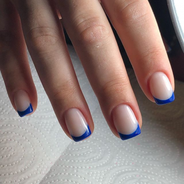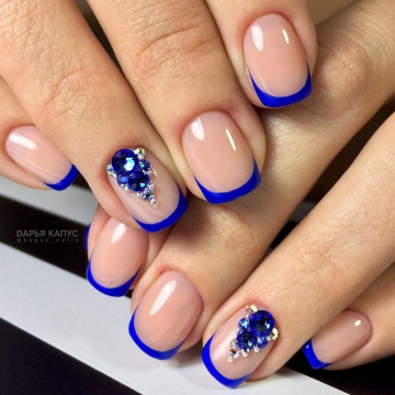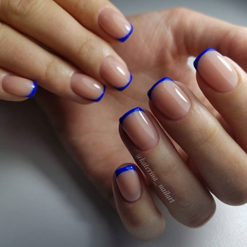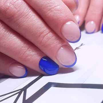 К ноготкам приклеивают трафареты для французского маникюра классической полукруглой формы. Свободный край перекрывается синим лаком или синей акриловой краской. Чем глубже и пронзительнее цвет, тем ярче и стильнее будет нейл-арт.