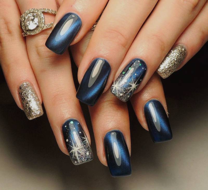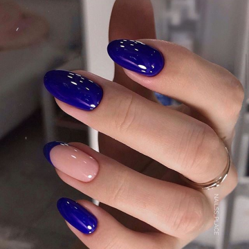 Обладательницам коротких ногтей подойдет цвет индиго и насыщенный темно-синий цвет. Это может быть как глянцевое покрытие, так и перламутровый лак с блестками. Не стоит забывать о переходе из более темного цвета в более светлый оттенок — эта техника пользуется большой популярностью среди модниц.
