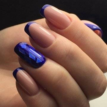 Не обойдем стороной и тему классических видов nail-дизайна, а именно французского и лунного маникюра. На сегодняшний день появилось множество различных комбинаций этих традиционных дизайнов. Часто в оформлении ногтей преобладают прямые геометрические линии. Стирается четкая грань между френчем и лунным дизайном, они могут быть скомпонованы в одном маникюре. Классический маникюр дополняют новыми аксессуарами для ногтей, выдумывают новые техники и т.д. Маникюр с синем цвете даже стилизованный под классику уже не выглядит уныло и скучно. Примеры вы можете увидеть на фото.