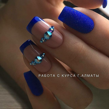 Как ни странно, но для коротких ногтей синий гель-лак тоже подходит. Только не нужно городить на ногтях слишком замысловатые рисунки. Лучше для декора использовать старые добрые стразы и блестки. Тем более что маникюр со стразами выполняется очень быстро и легко и не требует специальных навыков. Хорошо смотрятся короткие ногти с синим матовым маникюром. В дизайне лучше сочетать синий со светлыми оттенками, такими как белый, молочный, песочный, бежевый и т.д. Ноготь будет смотреться более длинным, если сделать полупрозрачный дизайн правильной формы. Линии в рисунке должны быть вертикальными.