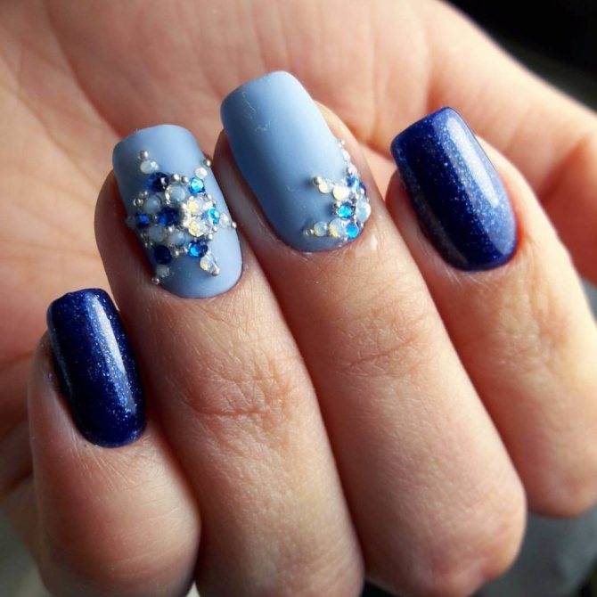 Длинные ногти — возможность для мастера сделать любой маникюр, о котором может мечтать клиентка. Синий цвет можно сделать матовым или блестящим, поэкспериментировать с акварельным покрытием или паутинкой. Крупные стразы на длинных ногтях будут смотреться дорого и вкусно.