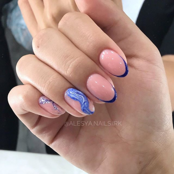 – дизайн ногтей можно выполнить в виде водного рисунка в васильковых оттенках на кончиках. Миндалевидные будут выгоднее всего смотреться;- выгодно будет смотреться пастельный фон в бежевых оттенках, черной «улыбкой» отделяется верх и низ пластины. На верх пластины можно нанести гель лак синего цвета, слегка отличающийся по тону;- база из нюдовых цветов, голубой верх в виде геометрических фигур, дополненный простыми черно-синими линиями в нескольких плоскостях, пересекающих всю ногтевую пластину, выглядит очень женственно и нежно;- на длинных ногтях выгодно смотрится акцентирования на 1 палец с помощью песочного покрытия, хотя остальные покрываются глянцевым или матовым лаком;- можно сделать незамысловатый дизайн в виде градиента от синих оттенков к нюдовым. При этом лучше выбирать не яркие тона, а более спокойные и светлый, например от нежно-голубого;- небесно-голубой идеально комбинируется с бежевым, персиковым и розовым фоном основного лакового покрытия. Этот вариант дизайна должен выполняться на не слишком длинные ноготки и более естественные формы, например, ногти миндаль;- на овальные формы можно использовать «улыбку» в виде точек, такое сочетание придаст образу нежности и женственности. Фото-новинки помогут определиться с размером и формой капель;- геометрические формы можно использовать в создании «улыбки», 2 пальца можно целиком покрыть цветом, при этом выбрав 2 близких синих оттенка, оставшиеся сделать в виде французского маникюра, используя эти оттенки для верха.