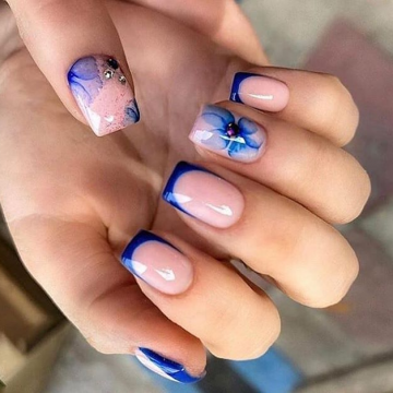 – на квадратные формы небольшой длинны можно сделать с добавлением золотой фольги и акцентированием на одном пальце.- можно использовать матовый гель лак, а безымянны палец полностью покрыть матовым лаком и нанести капельки-украшения.- короткие ногти выгодно смотрятся в обратном френче. Изгиб «улыбки» делается в другую сторону и опускается на середину ногтевой пластинки. Для украшения можно добавить незамысловатые черные линии. – можно выделить нейл арт с помощью матовых цветов. Подбирая матовый бежевый под основу и в таких же тонах спокойный голубой шеллак.- разнообразить можно с помощью разграничения верхней и нижней части с помощью золотой полосы. Прямо под синей «улыбкой» наносится золотой или серебряный лак.- можно сделать бело-синий маникюр, одни пальцы сверху покрывается голубым, а другие белым, как в классическом варианте французского маникюра. Острые формы больше всего подойдут под такой вариант.- использовать можно не только стандартный тип «улыбки», модный в 2022-2023, с обрамлением в виде геометрических линий. Красятся верхние углы ногтя в индиго, после чуть ниже наносятся 2 линии синего цвета.- при выделении 1 пальца его можно украсить геометрическими фигурами или росписями, что добавит образу нежности и легкости.- можно прибегнуть к инверсии, сделать фон синим, а «улыбку» или сам край ногтевой пластины выполнить в белом цвете.